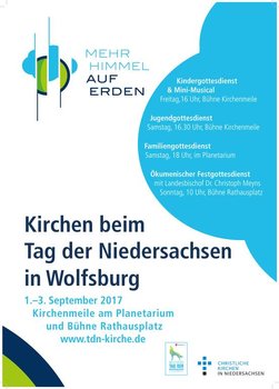 Wolfsburg. Mit dem Slogan „Mehr Himmel auf Erden“ präsentieren sich die christlichen Kirchen in Niedersachsen beim Tag der Niedersachsen vom 1. bis 3. September in Wolfsburg. Sie sind für die