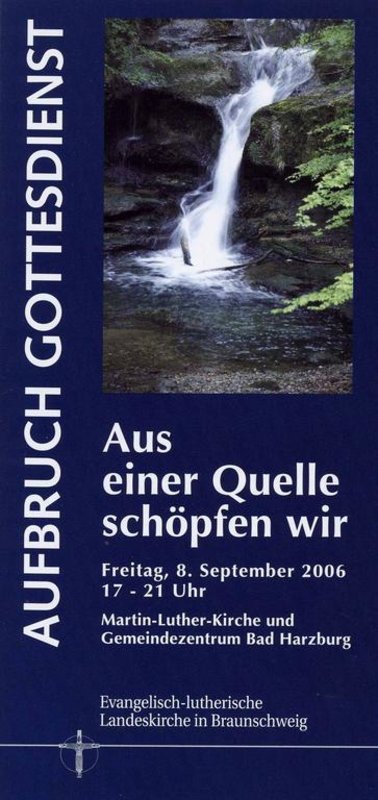 Braunschweig/Bad Harzburg. Ideen und Materialien für lebendige Gottesdienste bietet eine neue Veranstaltung des missionarischen Netzwerks Aufbruch in der Landeskirche Braunschweig am Freitag, 8. September, von 17 bis 21 Uhr in Bad Harzburg. Unter dem Motto "Aus einer Quelle schöpfen wir" stellen Workshops in der Martin-Luther-Kirche und im Gemeindezentrum verschiedene Gottesdienstformen vor. Die Veranstaltung beginnt mit einem Impulsreferat von Pfarrer Klaus Dettke (Kloster Bursfelde) über den Gottesdienst als Ort der Sehnsucht.