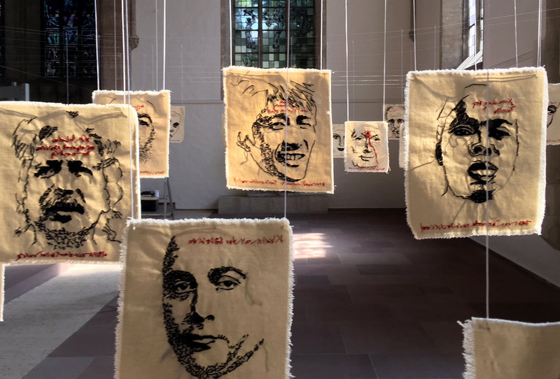 Die Münchener Künstlerin Sibylle Loew stickte unter dem Titel "Einwanderung" insgesamt 61 Porträts von Menschen, die zum Teil schon vor Jahrzehnten aus unterschiedlichen Regionen nach Deutschland kamen. Die Installation ist in der St.-Andreaskirche zu sehen.