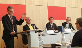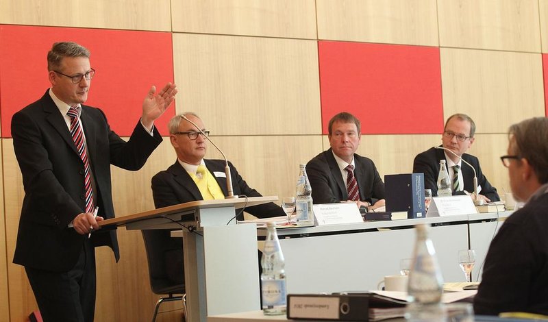 Stellte das Reformprojekt vor: Oberlandeskirchenrat Hans-Peter Vollbach (links). Das Präsidium unter Vorsitz von Synodenpräsident Dr. Peter Abramowski (Mitte) führte durch die Beratungen des Gesetzes.