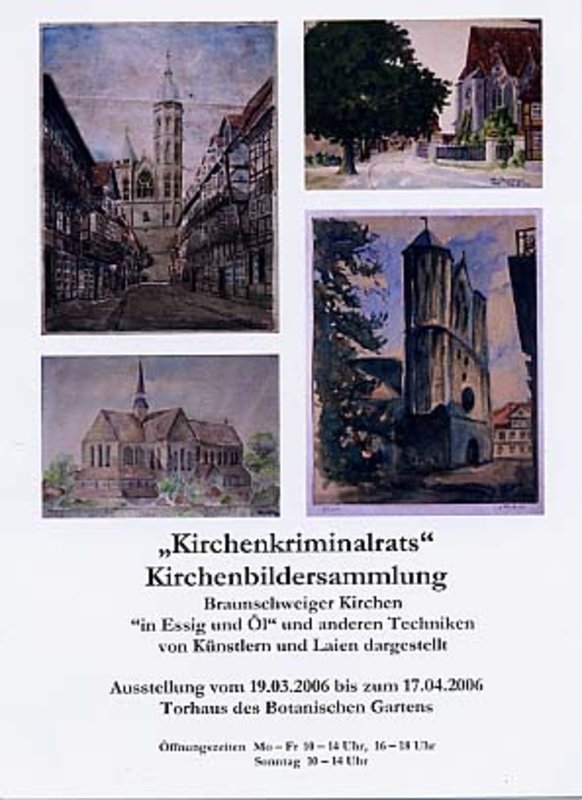 Braunschweig. Eine private Sammlung von Bildern Braunschweiger Kirchen mit 60 Exponaten ist vom 19. März bis zum 17. April im Torhaus des botanischen Gartens in Braunschweig zu sehen. Die von Laien und Künstlern gemalten Bilder zeigen Braunschweiger Stadtgeschichte von 1860 bis heute. Die Ausstellung wird eröffnet am Sonntag, 19. März, um 15 Uhr im Hörsaal des Instituts für Pflanzenbiologie. Pfarrer Wolfgang A. Jünke, der die Bilder in den zurückliegenden Jahren gesammelt hat, hält einen Einführungsvortrag. Öffnungszeiten sind: Montag bis Freitag 10 bis 14 und 16 bis 18 Uhr, Sonntag von 10 bis 14 Uhr. (Text: Thomas Dietl)