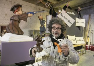 In den vergangenen anderthalb Monaten hat der Künstler in seiner Werkstatt aus Styropor-Blöcken die Figur Luthers ausgesägt und angemalt. Der Wagen ist fast fertig. Nur die von den Jecken ausgewählten fünf "Thesen der Gegenwart", in Anlehnung an Luthers 95 Thesen, müssen noch an den Seiten angeklebt werden. So lautet eine These "Endlich frei für Narretei". Ein weiterer Schriftzug verkündet "Endlich frei für Toleranz".