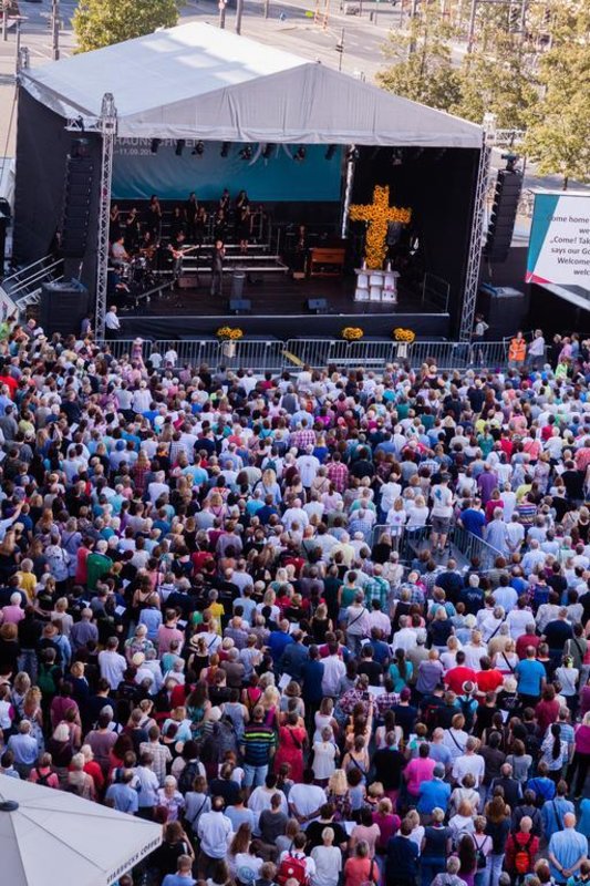 Braunschweig (epd). Der 54-jährige Manfred Kießling hüpft in seinen weißen Turnschuhen ausgelassen zu den Gospel-Rhythmen auf und ab. "Die Musik steckt einfach an", ruft er fröhlich. Der Maschinenbaukonstrukteur und Chorsänger ist aus dem rund 200 Kilometer entfernten westfälischen Herzebrock-Clarholz zum 8. Internationalen Gospelkirchentag nach Braunschweig gekommen. Zu dem dreitägigen Musikfestival unter dem Motto "Welcome home" versammelten sich vom 9. bis 11. September mehr als 40.000 Besucher in der niedersächsischen Stadt.