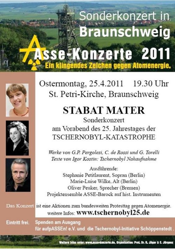 Am Vorabend des 25. Jahrestages der Tschernobyl-Katastrophe ist zudem ein Sonderkonzert geplant: Am Ostermontag, 25. April, um 19.30 Uhr erklingt in der Braunschweiger St. Petri-Kirche Pergolesis „Stabat Mater" mit Stephanie Petitlaurent (Sopran) und Marie-Luise Wilke (Alt). Der Schauspieler Oliver Peuker liest in der Veranstaltung aus Igor Kostins „Tschernobyl Nahaufnahme".