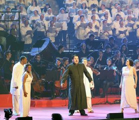 Braunschweig (epd). Mehr als 1.200 Sängerinnen und Sänger präsentierten am 29. April in Braunschweig vor rund 6.000 Zuschauern das Pop-Oratorium "Die 10 Gebote". Gemeinsam mit einem Sinfonie-Orchester, einer Band und Darstellern wie der Ex-"Monrose"-Sängerin Bahar Kizil brachten sie in der VW-Halle die biblische Geschichte auf die Bühne. Zahlreiche Kirchen-, Pop-, Gospel-, Schul- und Jugendchöre aus dem Gebiet der Evangelisch-lutherischen Landeskirche in Braunschweig wirkten an der Aufführung mit.
