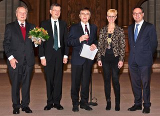 Abt Jerusalem-Preis 2017 (v.l.): Prof. Dr. Otto Richter, Präsident der Braunschweigischen Wissenschaftlichen Gesellschaft, Landesbischof Dr. Christoph Meyns, Prof. Dr. Jürgen Osterhammel, Prof. Dr. Anke Kaysser-Pyzalla, Präsidentin der TU Braunschweig, und Tobias Henkel, Direktor der Stiftung Braunschweigischer Kulturbesitz. Foto: Andreas Bormann