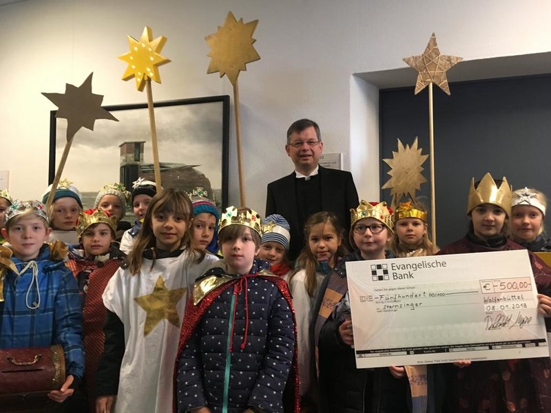 Wolfenbüttel. Kinder der katholischen Grundschule Harztorwall überbrachten am 8. Januar dem evangelischen Landeskirchenamt Wolfenbüttel die Grüße der Sternsinger. Unter dem Motto "Segen bringen, Segen sein" sammelten sie Spenden gegen die Kinderarbeit in Indien und weltweit". Landesbischof Dr. Christoph Meyns überreichte ihnen dafür einen Scheck über 500 Euro und dankte den Kindern für ihr soziales Engagement. Im Gegenzug schrieben die Kinder den Sternsinger-Segen "CMB" (Christus mansionem bendicat - Christus segne dieses Haus) an die Tür des Bischofsbüros.